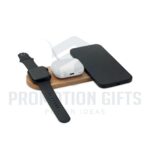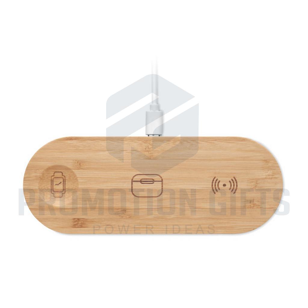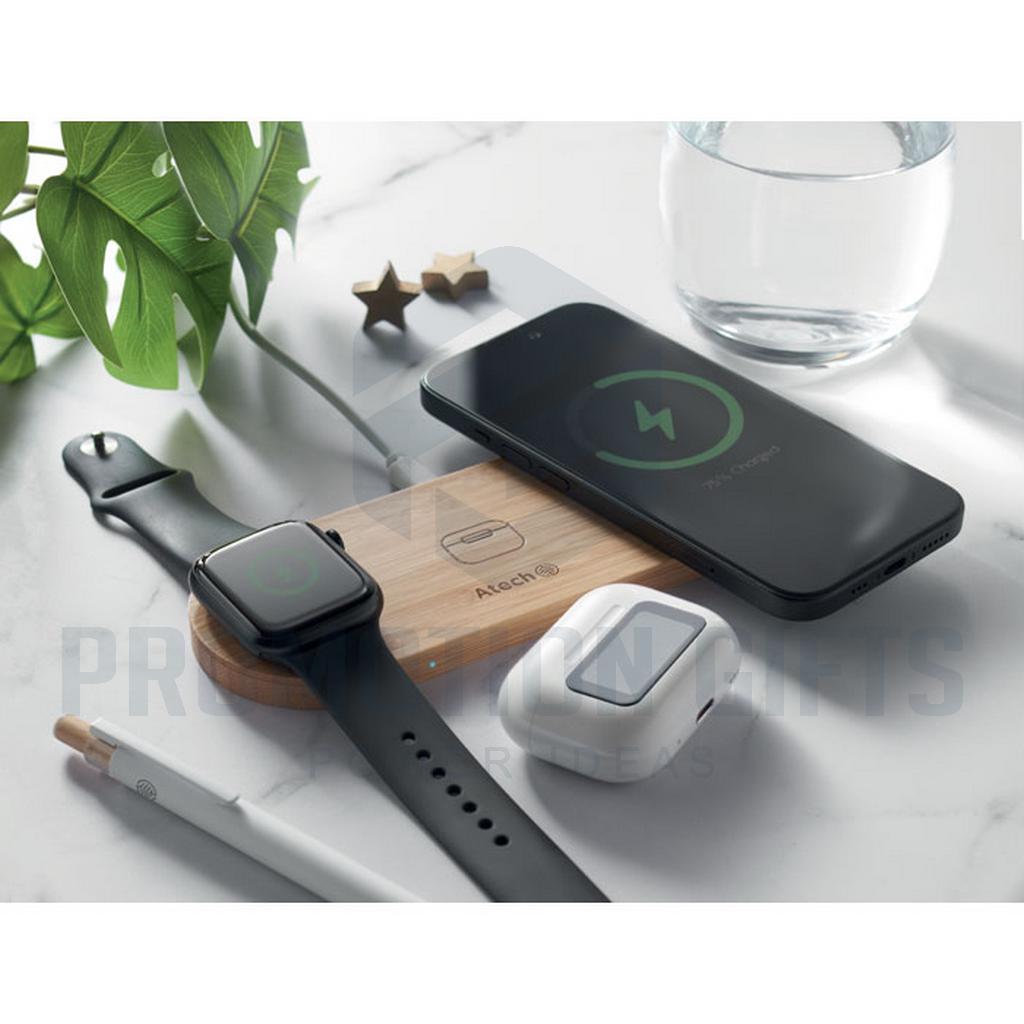 Διαφημιστικοί Πολυφορτιστές RECPAD. Σταθμός φόρτισης 3 σε 1 σε θήκη από μπαμπού. Περιλαμβάνει ασύρματο φορτιστή 15W, φορτιστή smartwatch (μόνο Apple®) και φορτιστή TWS.