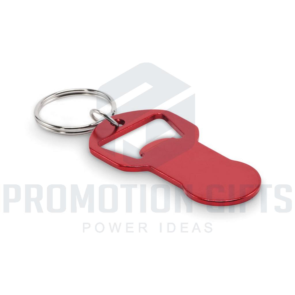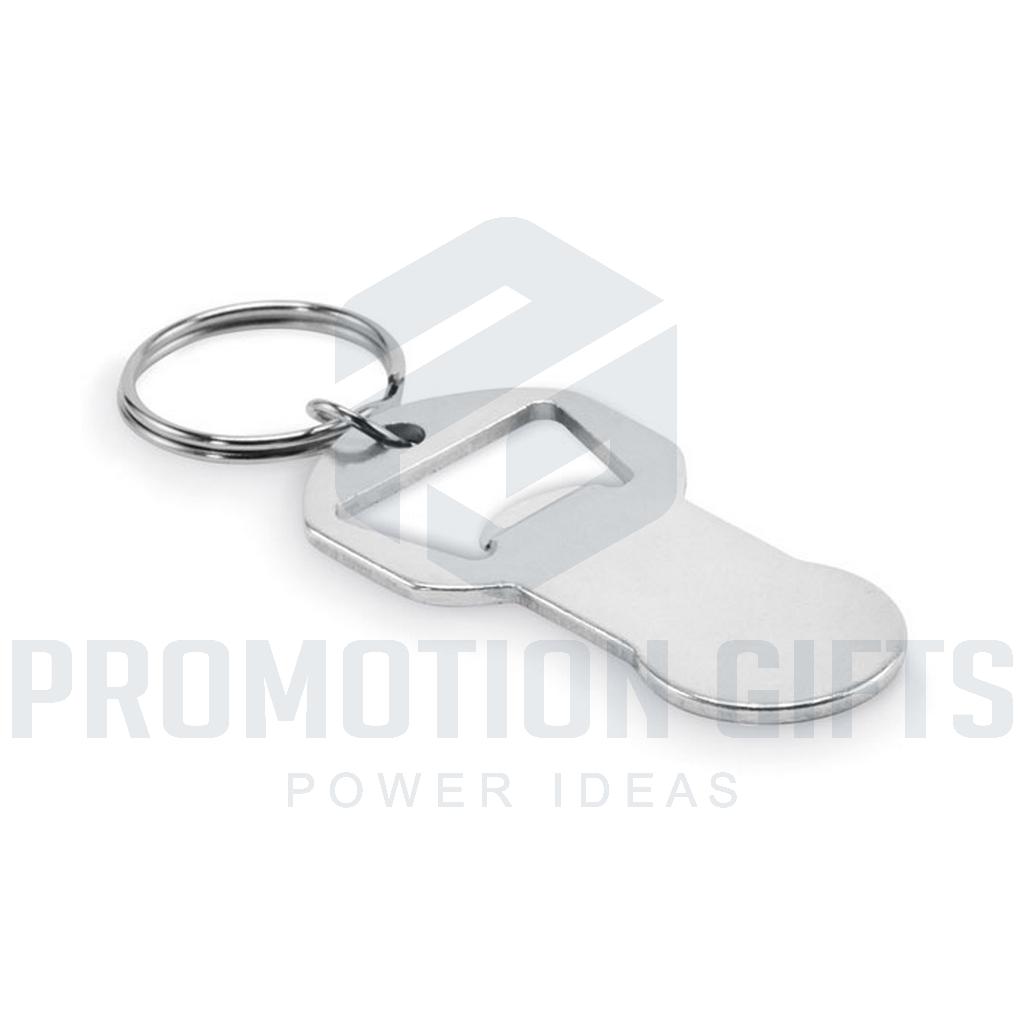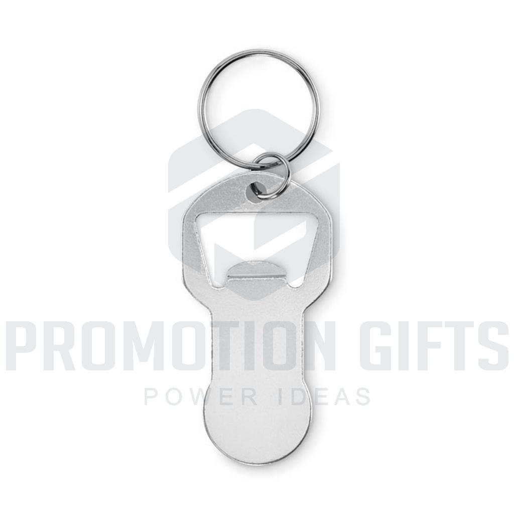 Διαφημιστικά Μπρελόκ με Ανοιχτήρι CLAVE. Μπρελόκ με μάρκες για ανοιχτήρι μπουκαλιών από ανακυκλωμένο αλουμίνιο με σιδερένιο δακτύλιο.