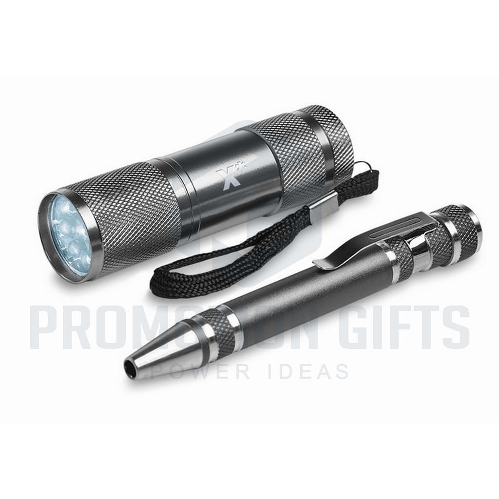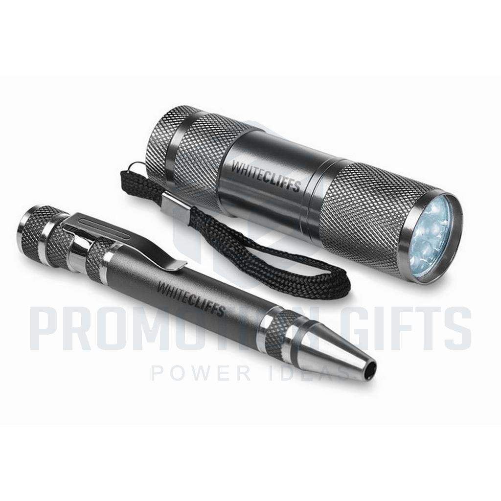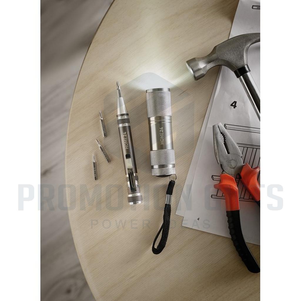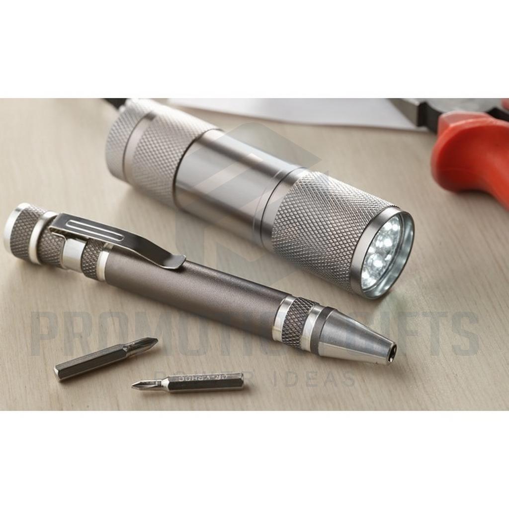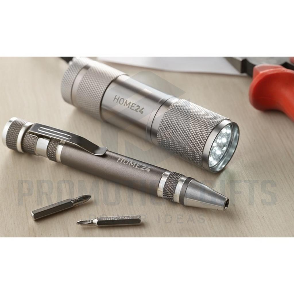 Διαφημιστικοί Φακοί Μπαταρίας & Πολυεργαλεία COMBITOOL. Σετ εργαλείων με φακό αλουμινίου 9 LED και πολυεργαλείο αλουμινίου σε σχήμα στυλό. Περιλαμβάνει 3 κεφαλές κατσαβιδιού με σχισμή και 3 κεφαλές κατσαβιδιού Phillips. Δεν περιλαμβάνονται 3 μπαταρίες AAA. Διατίθεται σε κουτί.