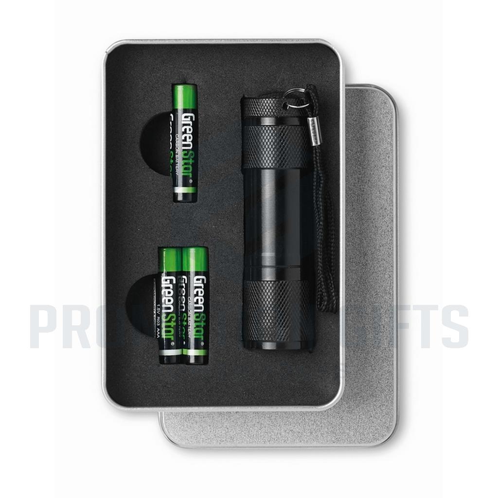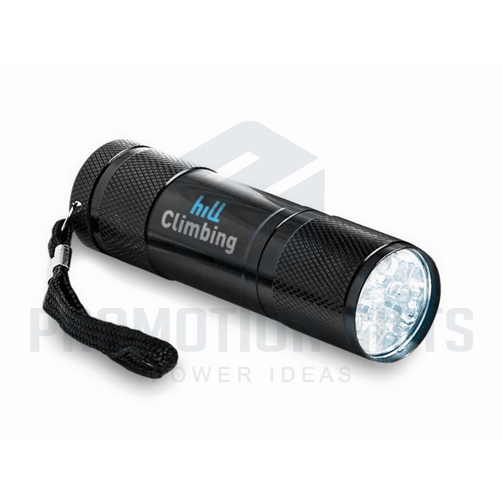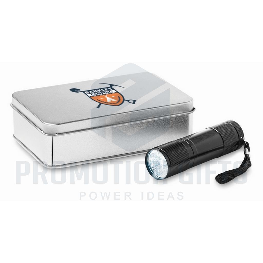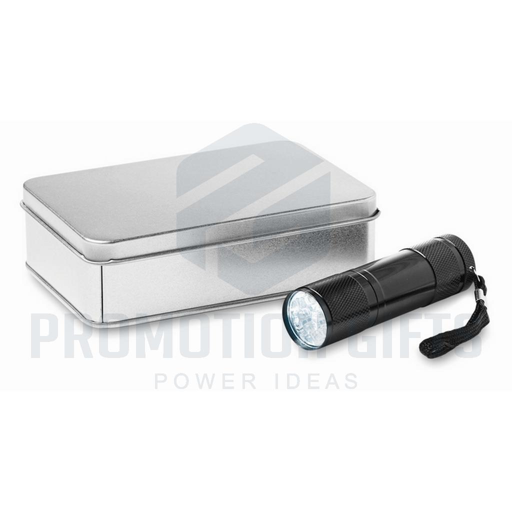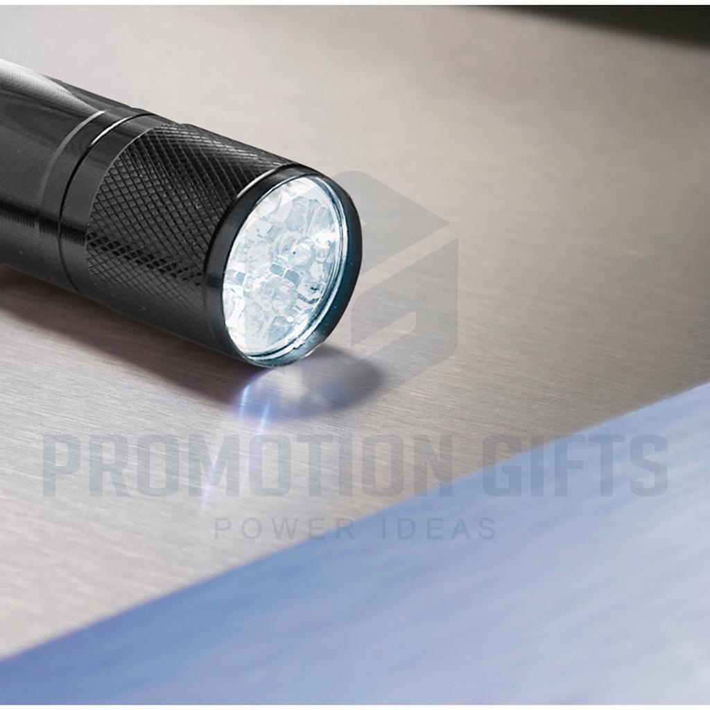 Διαφημιστικοί Φακοί Μπαταρίας LED PLUS. Φακός αλουμινίου 9 LED. Παραδίδεται με 3 μπαταρίες AAA και αποσπώμενο λουράκι. Διατίθεται σε μεταλλικό κουτί.
