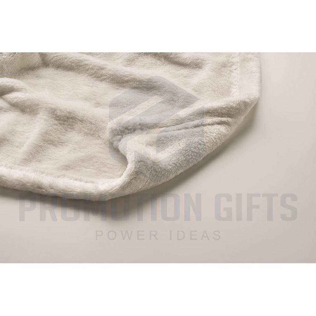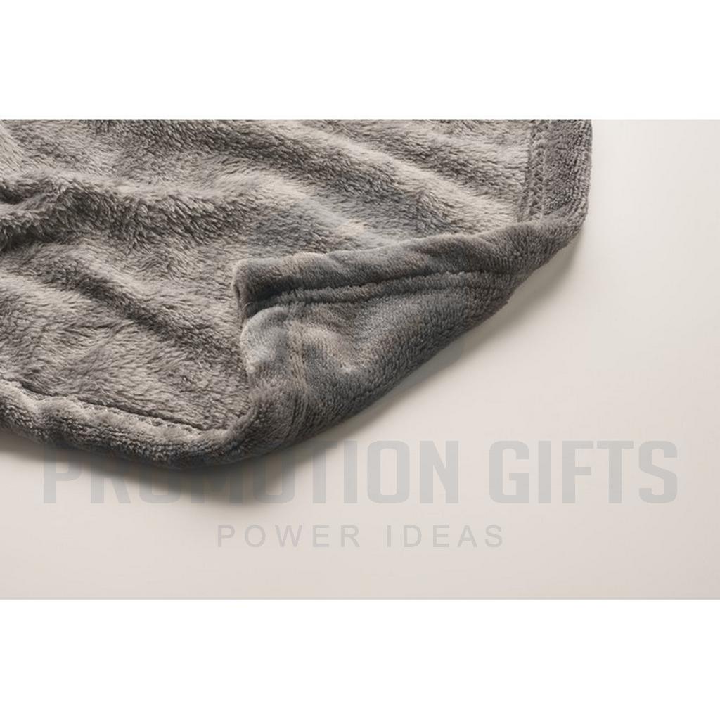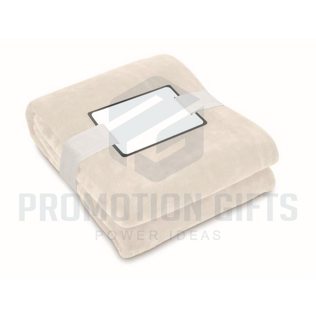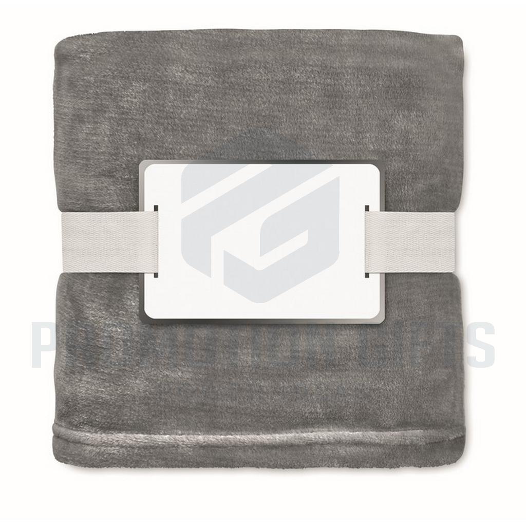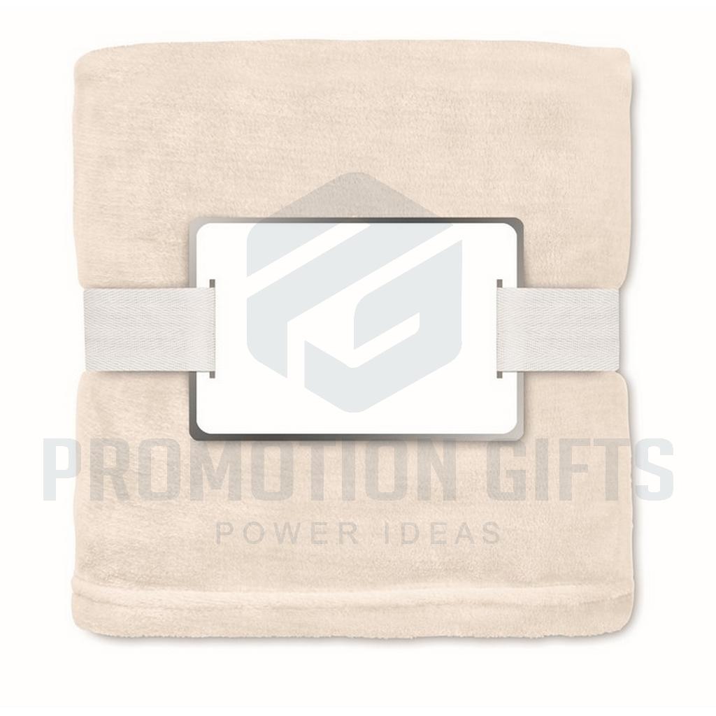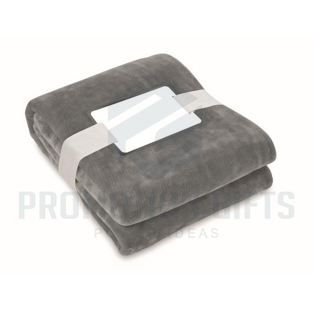 Διαφημιστικές Κουβέρτες LOGAN. Κουβέρτα από φανέλα RPET 280 gr/m² από fleece, τυλιγμένη σε κορδέλα με εκτυπώσιμο χαρτόνι.