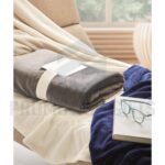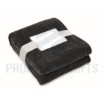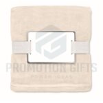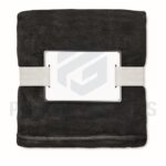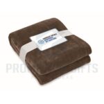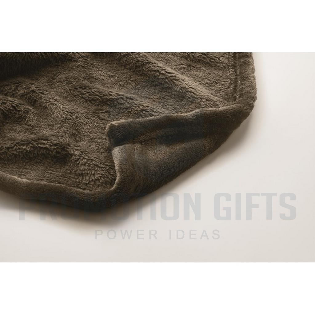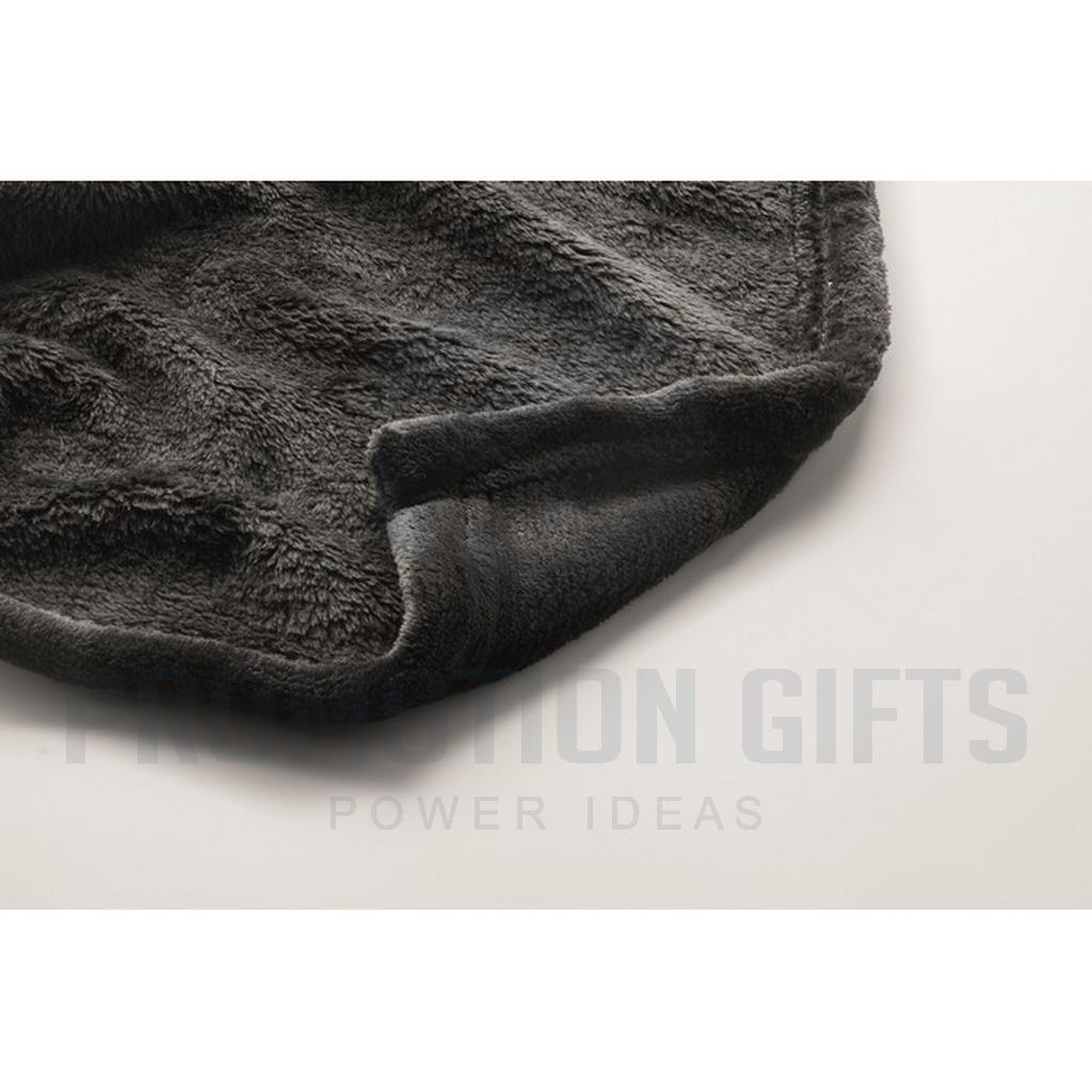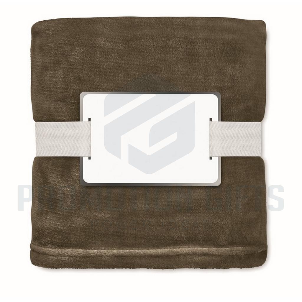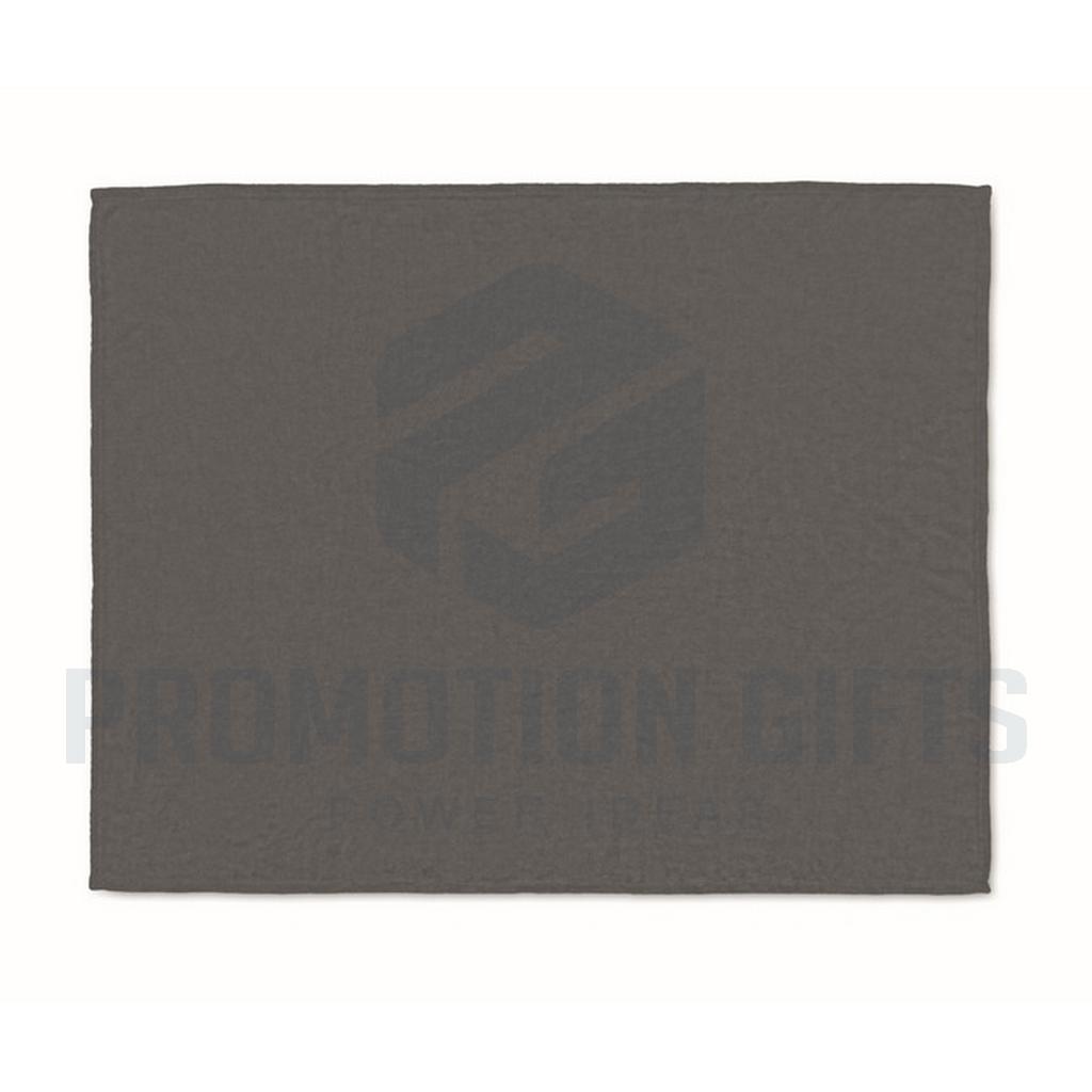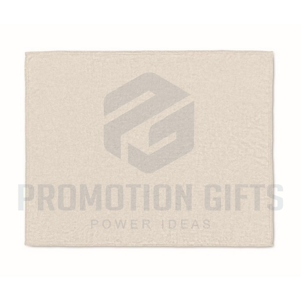 Διαφημιστικές Κουβέρτες LOGAN. Κουβέρτα από φανέλα RPET 280 gr/m² από fleece, τυλιγμένη σε κορδέλα με εκτυπώσιμο χαρτόνι.