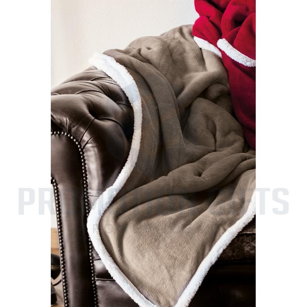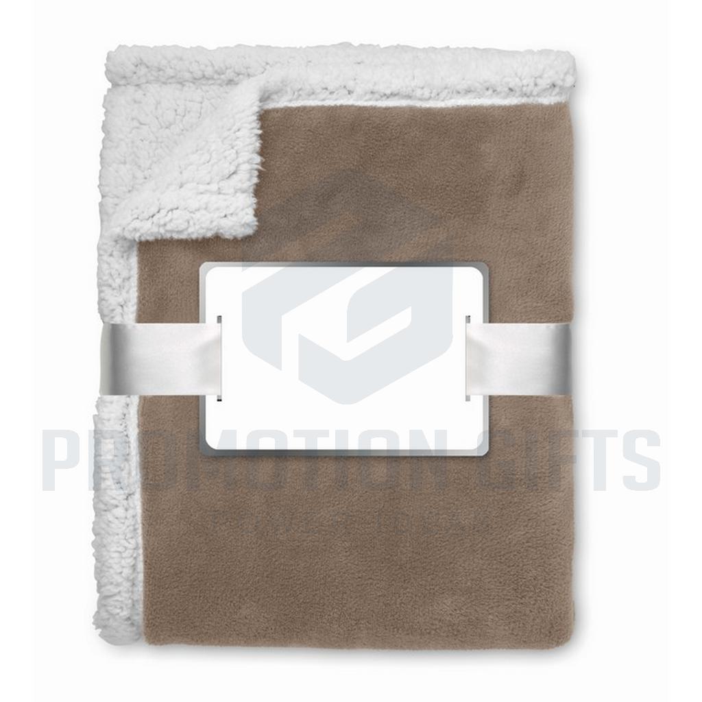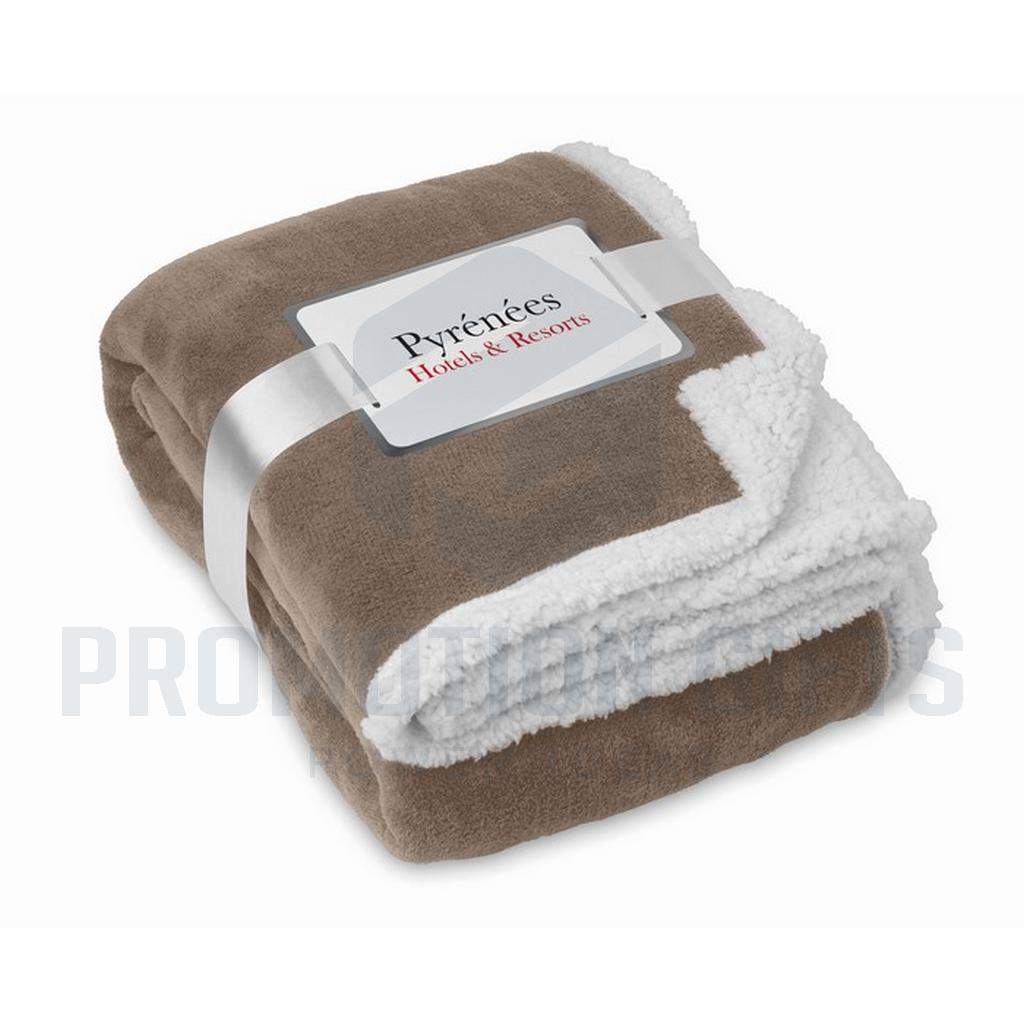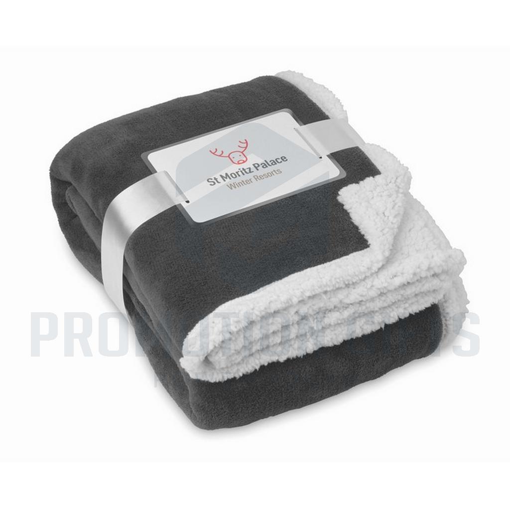 Διαφημιστικές Κουβέρτες ZERMATT. Κουβέρτα από coral fleece 200 gr/m² με αναστρέψιμη επένδυση από πολυεστέρα sherpa 220 gr/m². Τυλιγμένη με κορδέλα και εκτυπώσιμο χαρτόνι.